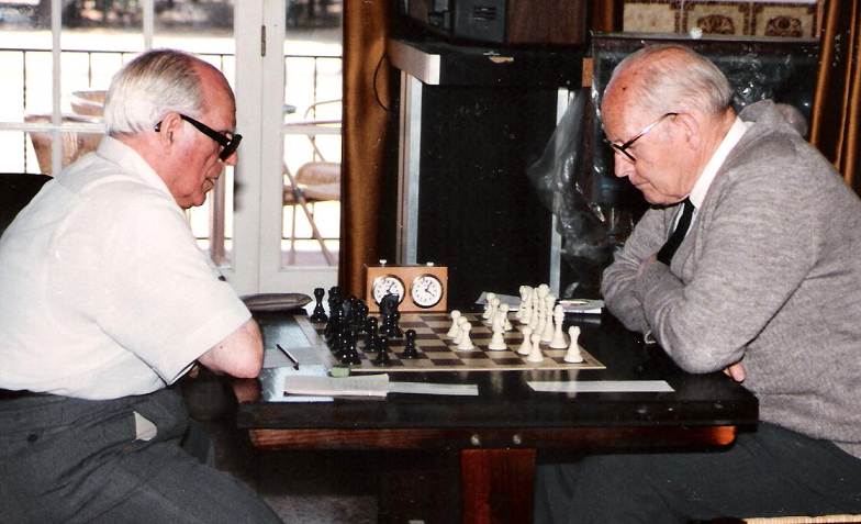 Y ahora, antes de terminar, este breve recuerdo a otro de los torneos importantes que se realizaron en Cataluña, gracias a los muchos dirigentes y jugadores que organizaron y compitieron, salvando mil obstáculos, ahí tenemos una foto de dos de ellos. Ferran Ros, a la izquierda, –participante en este torneo de Sabadell- y Ángel Ribera, a la derecha -que había participado en los de Barcelona 1929, Sitges 1934, Barcelona 1935, Reus 1936, Vic 1949…- en la final del Campeonato de Cataluña de Veteranos, el 8 de junio de 1988, en Malgrat de Mar, cuarenta y tres años después de este IV Torneo Internacional de Ajedrez de Sabadell, jugando con la misma ilusión, seriedad e interés con que lo hicieron en su juventud.
