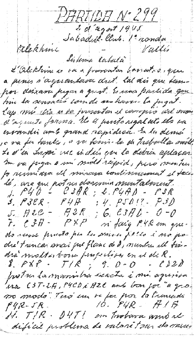 Según cuenta Vallés en su cuaderno personal, Alekhine se presentó a jugar en estado etílico y que apenas se podía sostener. Pero es que con su estado tampoco dejaba jugar. Vallés reconoce que tuvo la sensación de no haberla jugado. Alekhine jugó la partida de forma muy rápida y no dejaba de mirar al tablero de forma continuada, aunque daba la impresión que estaba durmiendo… con los ojos abiertos. En ninguna otra partida del torneo se presentó Alekhine de la forma que hemos indicado. Verdaderamente un espectáculo lamentable, que no entiendo como el árbitro del torneo no sancionó de inmediato. Bien, sí lo entiendo, se trataba de Alekhine y si hubiese sido eliminado en la primera ronda, el torneo hubiera pasado a mejor vida, con toda seguridad.