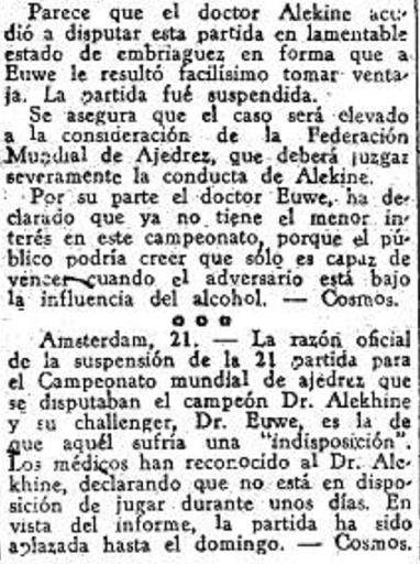 Pero esta situación personal, en Alekhine, no era una novedad. Ya le había sucedido algo parecido en su match para el título mundial contra Euwe, en 1935, que tuvo que suspenderse y retrasar unos cuantos días la siguiente partida. Para evitar un castigo de la FIDE, se informó a ésta de que Alekhine estaba “indispuesto” (ver recorte de prensa aparecido en Mundo Deportivo).