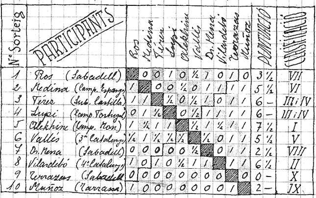 Y ahora, como curiosidad, quisiera incluir el cuadro de puntuación y unos comentarios sobre el torneo, anotados en catalán por el propio Vicenç Vallés, en la página 145 de su cuaderno de memorias. Tanto estas anotaciones como las diversas páginas en las que constan todas las partidas jugadas por Vallés en este torneo, y que figuran en el pgn adjunto, me han sido facilitadas por el amigo Josep Alió, de Tarragona, en aras de poder completar de forma más exhaustiva este resumen. En este sentido tenemos que decir que las ocho partidas incluidas de Vallés –excepto la jugada contra Alekhine, y que luego comentaremos- son prácticamente inéditas.
