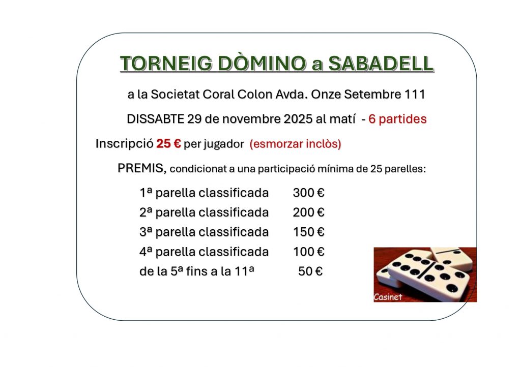 Torneig dòmino a la SCC ACTIVITATS DE COMPETICIÓ Publicat fa 12 dies | per BET Inscripcions a la mateixa entitat o enviant e-mail a: administració@coralcolon.net