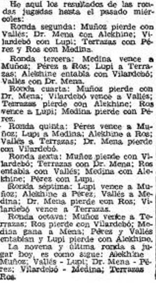 Según cuenta Vallés en su cuaderno personal, Alekhine se presentó a jugar en estado etílico y que apenas se podía sostener. Pero es que con su estado tampoco dejaba jugar. Vallés reconoce que tuvo la sensación de no haberla jugado. Alekhine jugó la partida de forma muy rápida y no dejaba de mirar al tablero de forma continuada, aunque daba la impresión que estaba durmiendo… con los ojos abiertos. En ninguna otra partida del torneo se presentó Alekhine de la forma que hemos indicado. Verdaderamente un espectáculo lamentable, que no entiendo como el árbitro del torneo no sancionó de inmediato. Bien, sí lo entiendo, se trataba de Alekhine y si hubiese sido eliminado en la primera ronda, el torneo hubiera pasado a mejor vida, con toda seguridad.