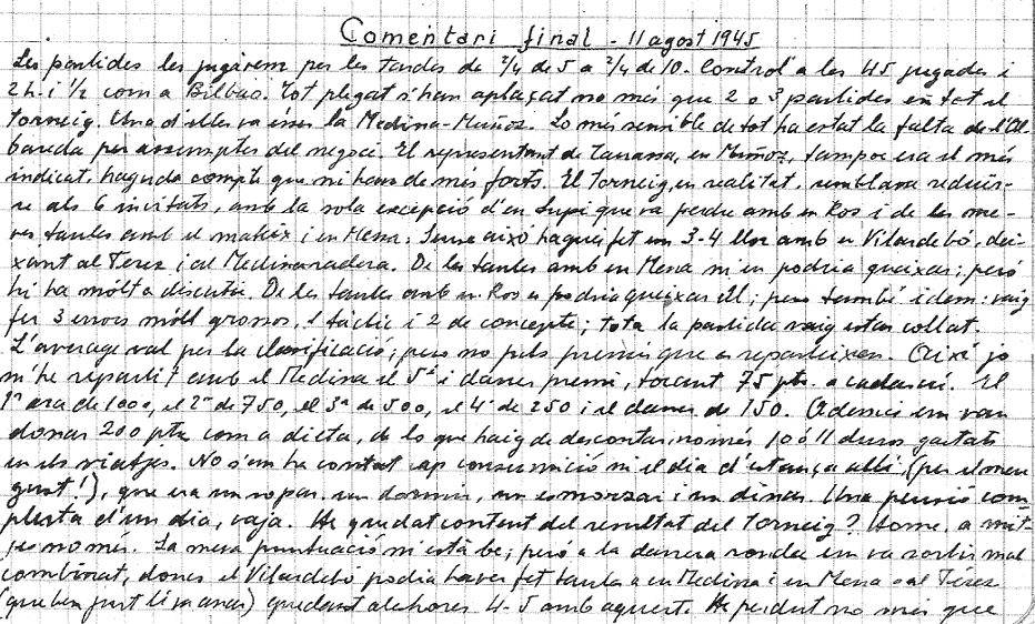 Y ahora, como curiosidad, quisiera incluir el cuadro de puntuación y unos comentarios sobre el torneo, anotados en catalán por el propio Vicenç Vallés, en la página 145 de su cuaderno de memorias. Tanto estas anotaciones como las diversas páginas en las que constan todas las partidas jugadas por Vallés en este torneo, y que figuran en el pgn adjunto, me han sido facilitadas por el amigo Josep Alió, de Tarragona, en aras de poder completar de forma más exhaustiva este resumen. En este sentido tenemos que decir que las ocho partidas incluidas de Vallés –excepto la jugada contra Alekhine, y que luego comentaremos- son prácticamente inéditas.
